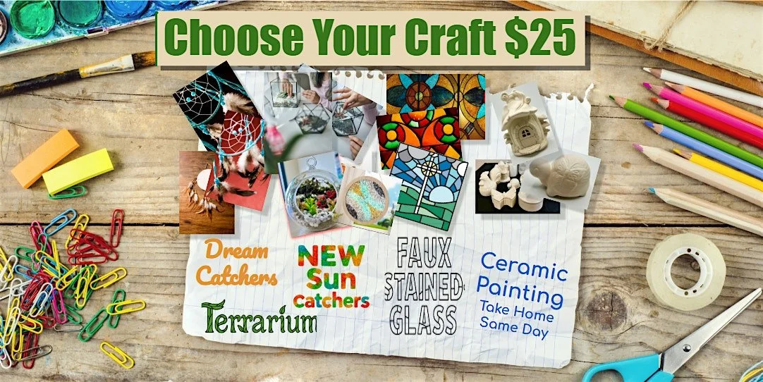 New Crafts in the Studio! Join us for a "Choose Your Craft" Workshop! Choose Dream Catchers, Terrarium (Succulents or Fairy Garden), Faux Stained-Glass, NEW Sun Catchers, or Ceramic Painting!